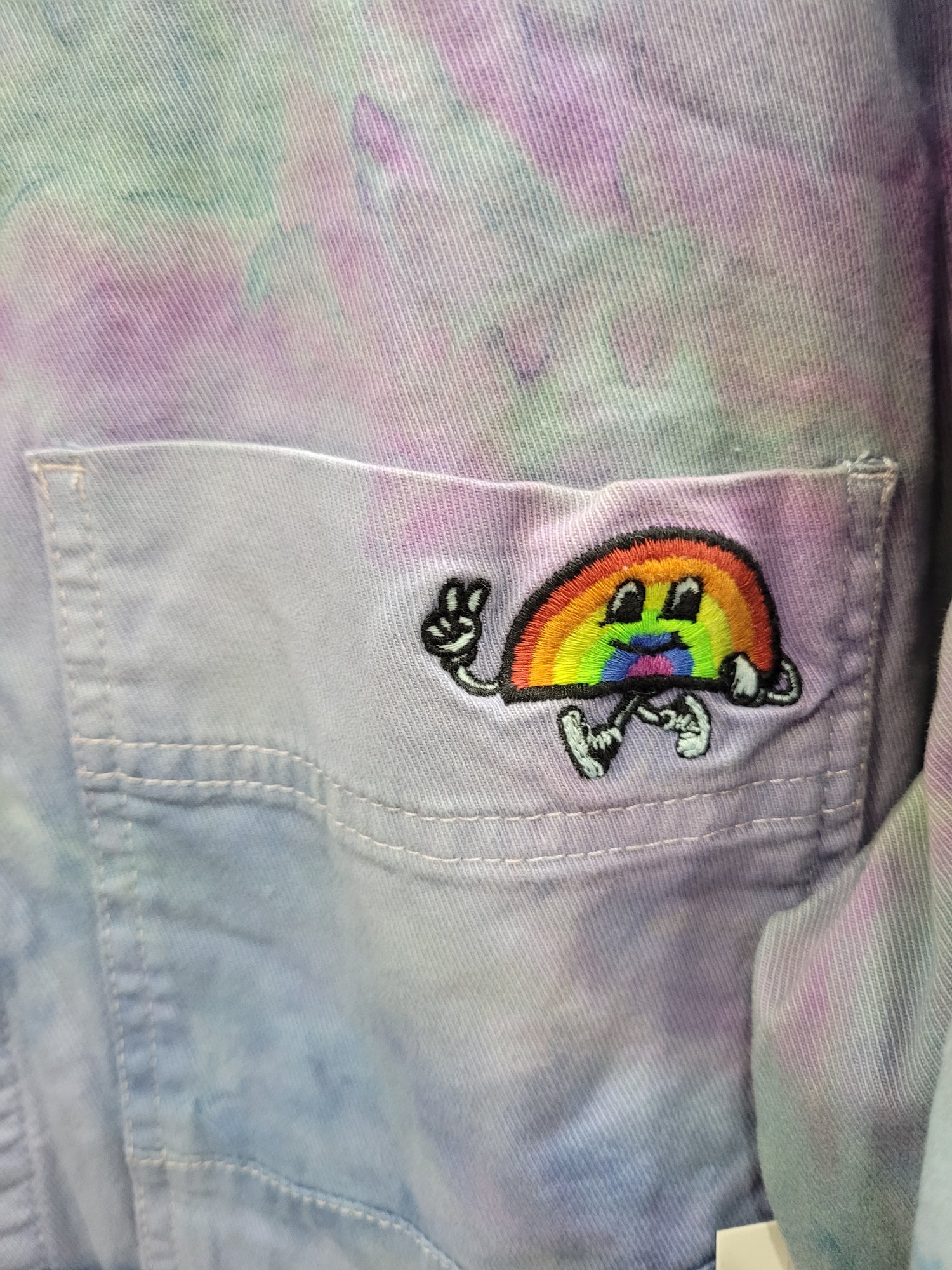 Purples, blues, & greens dance acrossbrand. Hand Dyed long-sleeved coveralls. Gendar Neutral sizing, Old Navy beand.