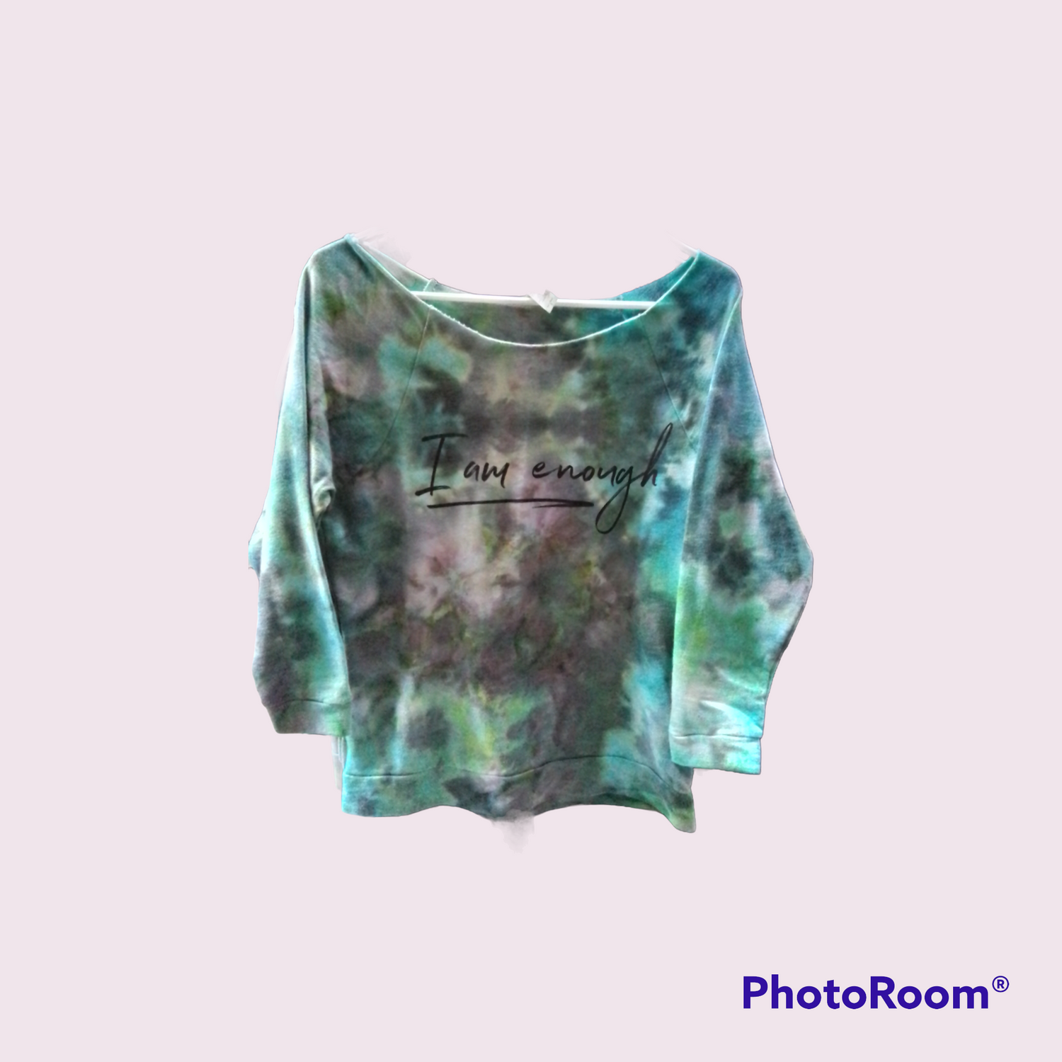 ReVamped wide-neck cotton sweatshirt. Ice Dyed in purple, teal, lime green, and more. Each item is unique. Colors will vary.