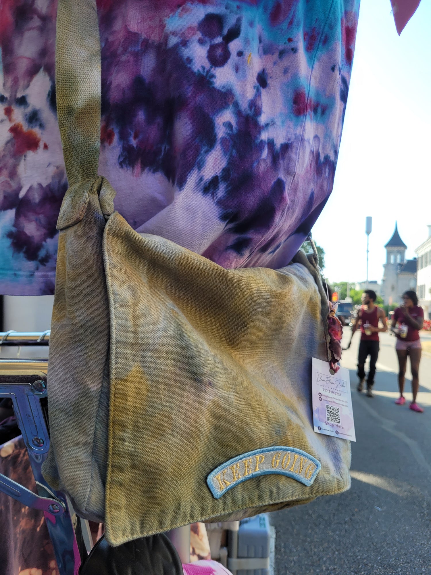 Bag Measures 4.5 inches wide (deep) by 13 inches long and 9.5 tall. The 1.5 inch cotton, woven strap adjust from 32 inches to 64 inches long making it comfortable for everyone. Can fit your phone, wallet, Sudoku book, and everything your husband/kids/dogs need you to carry!
